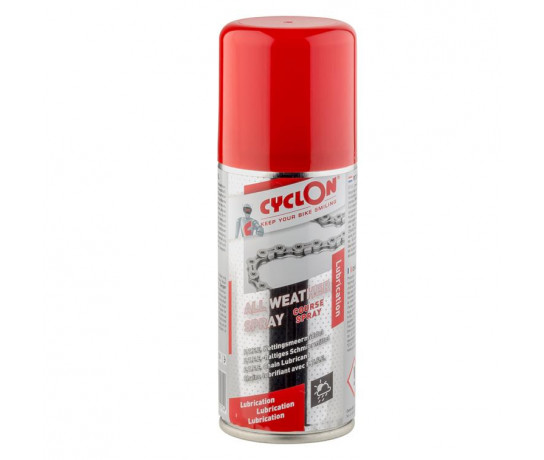 - Cyclon All Weather Spray 100ml is een smeermiddel voor alle weersomstandigheden voor kettingen, derailleurs, kabels en pedalen. Vormt een dunne smeerlaag en dringt goed door zodat het op de juiste plaats komt. Deze spray vermindert wrijving en beschermt tegen slijtage.